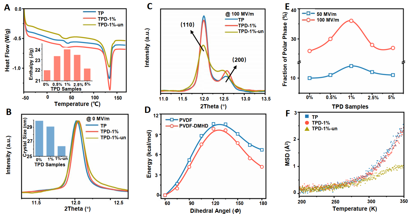 DSC和XRD 测试结果说明了改性样品的结晶度略微提高,晶粒尺寸略有减小,这暗示了极性结晶畴确实大部分被限制在界面上,在体积分量上的表现并不显著。原位WAXD研究了电场作用下三维体相晶体结构的动态转变,引入的DMHD小分子确实会诱导基底聚合物产生强烈的相变。DFT和MD模型也直观表明,DMHD可以降低非极性-极性相变势垒,由于界面氢键相互作用的存在。弹性中子散射结果显示未退火前TPD-un的均方位移最小,表明氢离子被紧密限制在小分子表面附近,通过牺牲DMHD可释放大表面积的极性构像界面的约束,促使TPD产生巨电卡效应。