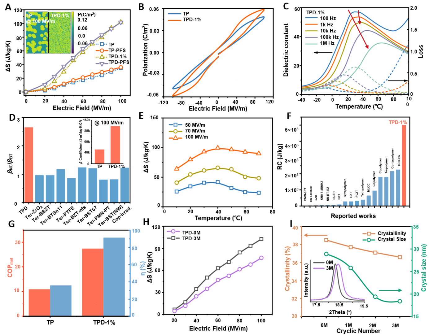 TPD巨电卡效应在室温附近具有良好的温度稳定性,可以覆盖10℃到70℃的有效温度窗口,因此可以得到最大的RC制冷能力。TPD的制冷效率COPmat和普通聚合物相比提高了250%,这可进一步减小电源的尺寸和重量,为潜在的便携式电卡冷却装置提供动力。TPD样品在最长300万次的循环寿命(> 70天)内表现出优越的电卡诱导熵变化,使其成为实用电卡器件的良好候选者。