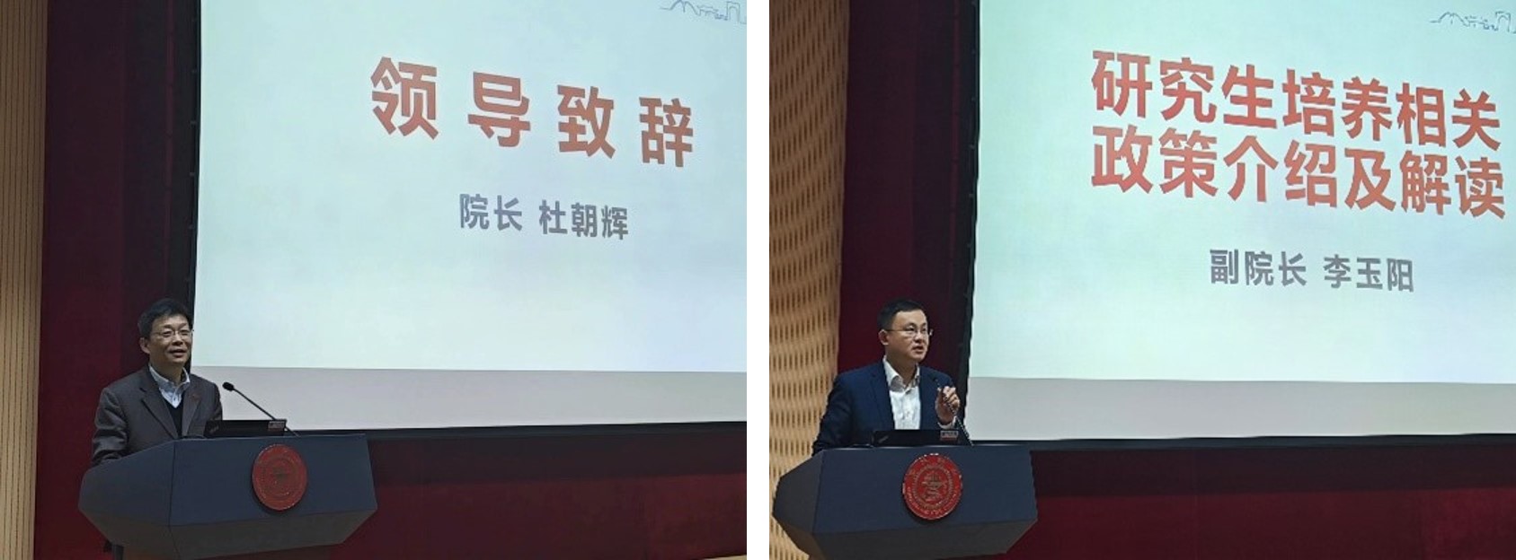 杜朝辉致辞,强调研究生导师应坚持“从严、重导、求新、关爱”的原则,严格遵守学校学院规章制度,做好价值引领,引导学生热爱科研。李玉阳介绍了学院研究生培养相关政策和规章制度,阐释了基地招生、直博招生改革、博导遴选、学术自治管理等工作。