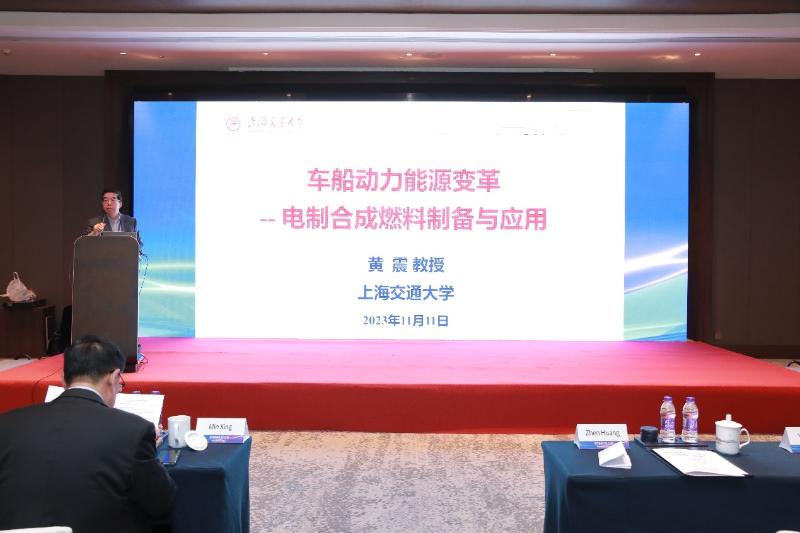 主旨报告环节,专家们对车船动力能源及动力技术未来发展趋势进行了深层次分析与展望。黄震院士作了题为“车船动力能源变革—电制合成燃料制备与应用”的主旨报告。他指出碳中和目标下我们正面临一场史无前例的由化石能源走向新能源的能源绿色转型,从国际上车船减碳政策的演进趋势看,全球汽车与船舶航运业正加速进入低碳和零碳时代。电制燃料是利用零碳电力,制取氢、氨和合成燃料,它既提供绿色燃料,又是一种新型储能方式,在储能规模和储能时间方面具有独特优势,便于储存与运输,可实现跨季节大规模储能与广域共享,是车船动力能源绿色转型的重要方向。沙特阿美全球研发中心交通战略分析部部长 Hassan Babiker作了题为“可持续动力技术展望”的报告,中远海运集团上海远洋运输有限公司董事长秦江平作“把握政策和策略,推进集运绿色转型发展”报告,青海民族大学副校长、天津大学讲席教授尧命发分享报告“燃料储能在(净)零碳能源系统应用探讨”,全球甲醇行业协会中国区首席代表赵凯以“甲醇能源应用及进展”为主题进行了报告分享。