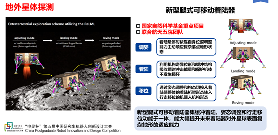 为应对错综复杂的地外星体探索环境,项目提出一种“调姿-缓冲着陆-移位”一体化的新型腿式步行着陆器,该机器人着陆悬停时依靠自身位姿调整能力,主动顺应复杂落点地形状态,着陆时利用机构奇异位形和缓冲结构,吸收瞬时冲击能量,并保护机体不发生损坏,再通过姿态调整和构态切换,从着陆器整体的着陆桁架形态转入行走移位的机器人机构形态,大幅提升未来着陆器对外星球表面复杂地表的适应能力。