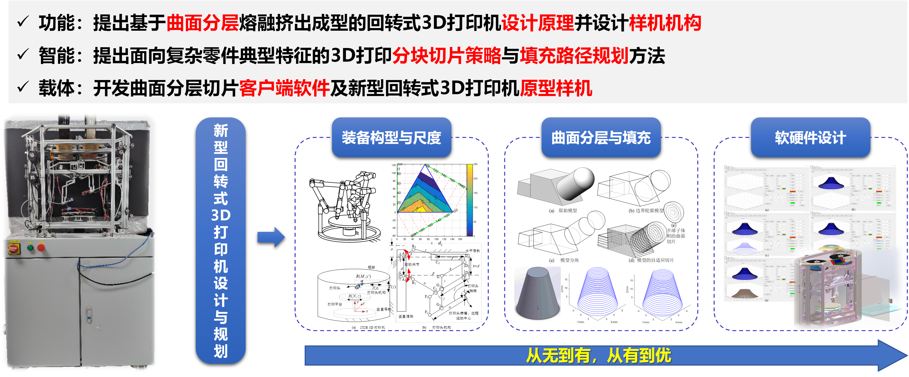 在增材制造(3D打印)领域,曲面打印能够有效缓解甚至消除传统平面打印中存在的阶梯效应、各向异性以及支撑结构去除难等问题,但是发展这项技术需要研发具备曲面打印能力的多自由度3D打印装备和曲面分层切片,及其路径规划算法。项目提出了自适应切片策略及其填充路径规划方法,并开发了支持曲面分层的客户端软件;提出了曲面打印装备“功能-构型-结构”创新设计的框架,并设计了新型回转式3D打印机原型样机,为现代机器设计理论与曲面打印技术的集成提供了新场景。