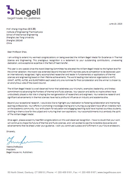 近日,传热及热科学领域享有盛誉的国际最高奖项之一威廉·贝格尔奖章(William Begell Medal For Excellence in Thermal Science and Engineering based on lifetime achievements)正式揭晓,365英国上市公司官网365英国上市公司官网赵长颖教授因在微纳尺度传热、热辐射、多孔介质传热及高效储热等热科学领域做出的杰出贡献获此殊荣。颁奖典礼将于8月份在南非开普敦举办的第17届国际传热大会上举行,赵长颖教授将做William Begell Medal Award Lecture大会主旨报告。
