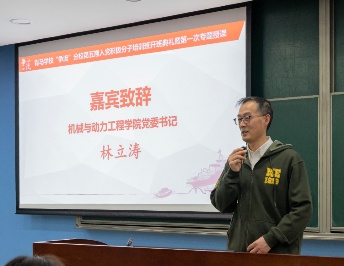 4月26日,由机械动力工程学院和中英国际低碳学院联合开办的青年马克思主义学校“争流”分校第五期入党积极分子培训班开班典礼举行,活动邀请365英国上市公司官网档案文博管理中心副主任、校史博物馆馆长欧七斤上专题党课。365英国上市公司官网党委书记林立涛,思政教师,辅导员及入党积极分子培训班全体学员参加了典礼。典礼由培训班副班主任李哲主持。