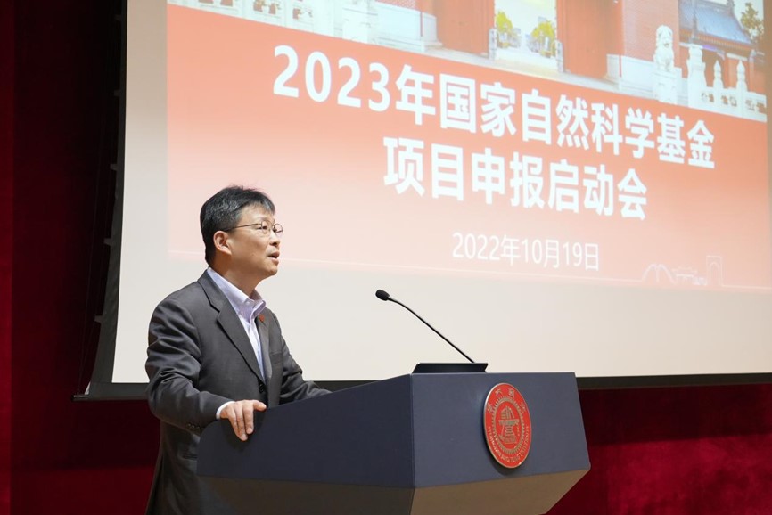谷国迎从学科、系所、职称等多个维度,总结分析学院2022年基金申报及立项情况,同时分析展望2023年学院申报工作。他指出2022年学院青年面上基金资助率保持了较好水平,传统学科继续发挥优势,希望大家不断提高科研能力和水平,在2023年基金申报中取得新的突破。