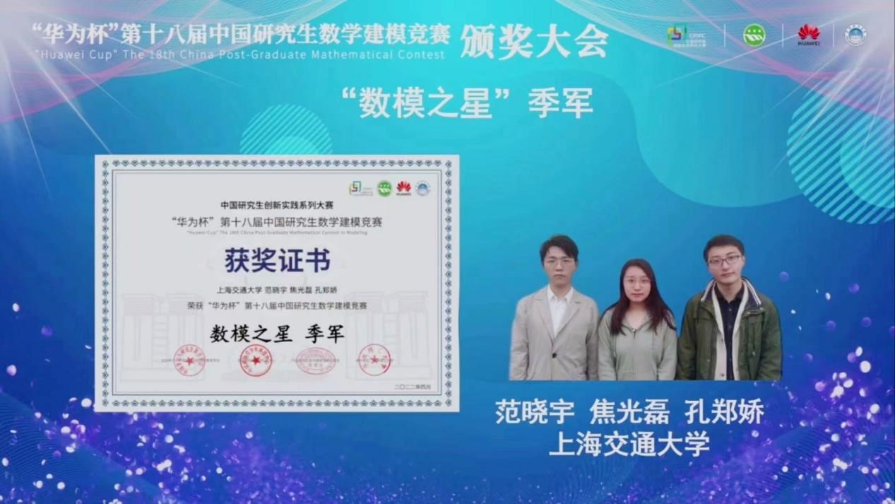 4月24日,“华为杯”第十八届中国研究生数学建模竞赛圆满落幕,365英国官网工业工程与管理系研究生范晓宇、焦光磊、孔郑娇组成的团队获“数模之星”全国季军,是我校在中国研究生数学建模竞赛中取得的最好成绩,其中团队参加的航空公司机组优化排班问题赛题,成绩位列全国第1名。