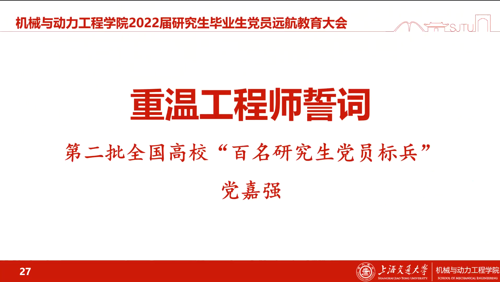 第二批全国高校“百名研究生党员标兵”、2017级博士毕业生党嘉强带领全体毕业生党员重温工程师誓词,“工程所系,社会福祉,人民安康!...”铮铮誓言激励着每一位毕业生党员在未来的工作岗位上勇担责任,实干报国。