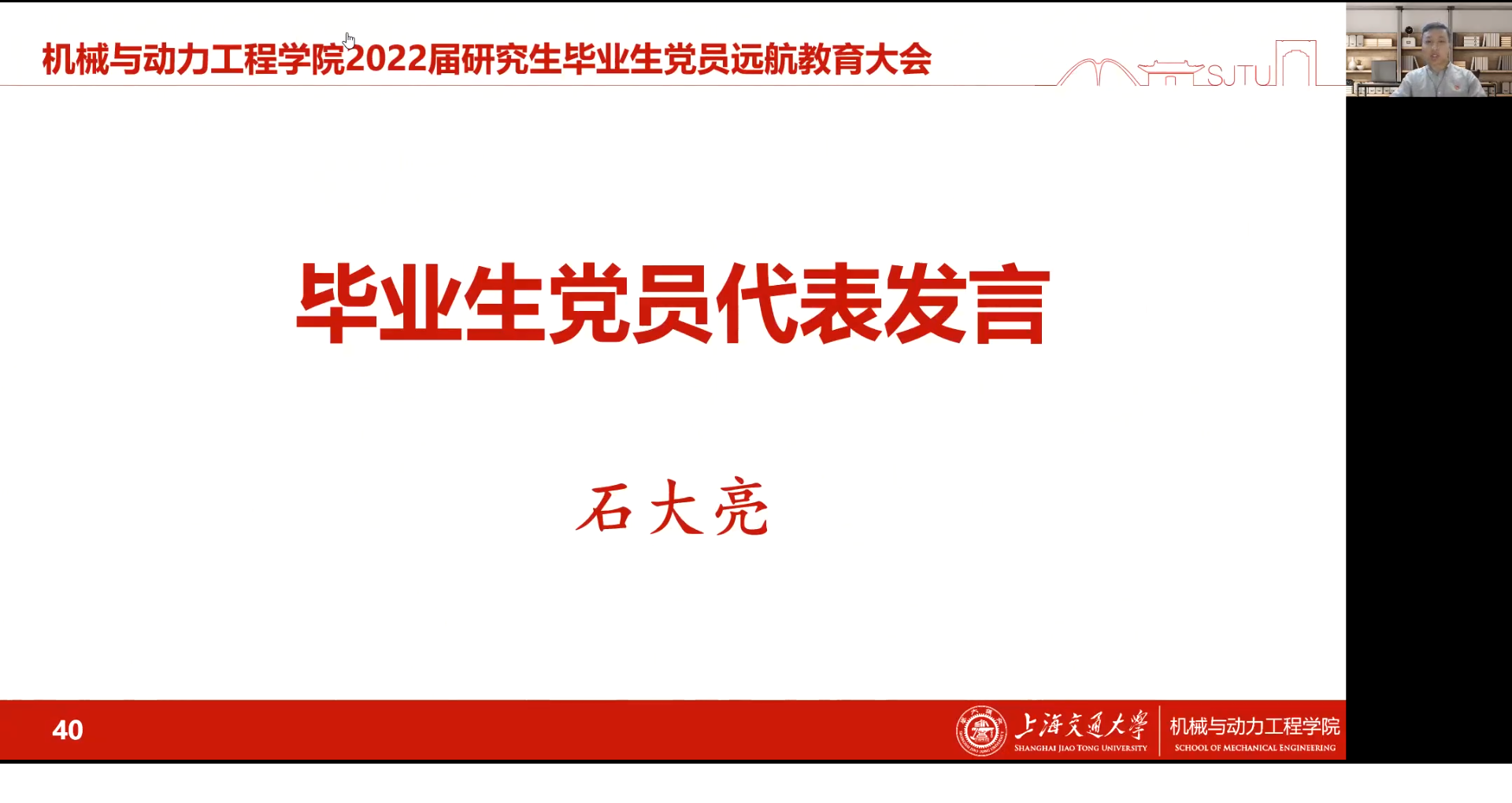 新能源动力研究所硕士生党支部原书记,即将赴四川从事选调生工作的2019级硕士毕业生石大亮作为学生代表,回顾了在交大的学习生活经历,号召大家敢于追梦、勤于逐梦、善于圆梦,把青春和奋斗融入党和人民的事业,成为实现中华民族伟大复兴的先锋力量。