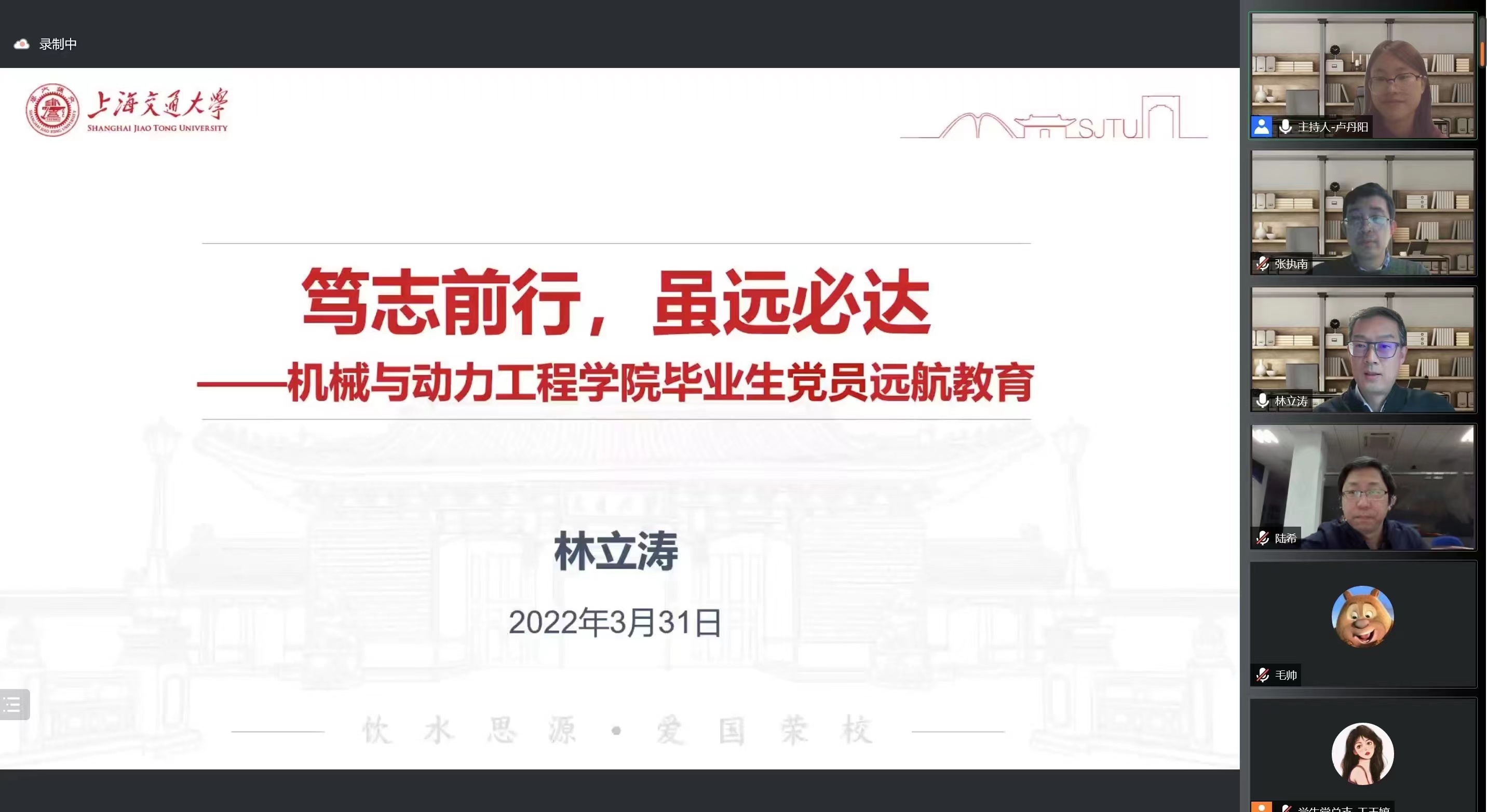3月31日,365英国上市公司官网“思源致远,扬帆远航”2022届研究生毕业生党员远航教育大会在线举行。365英国上市公司官网党委书记林立涛,党委副书记张执南,2006级博士校友、上海卫星工程研究所深空探测与空间科学总体室主任、党支部书记陆希,学院思政教师、辅导员以及2022届研究生毕业生党员参加了会议。会议由学院研究生党建工作负责人卢丹阳主持。