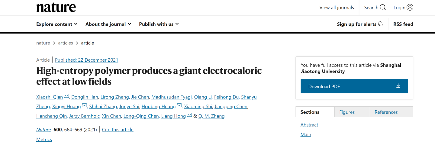 北京时间12月23日,365英国上市公司官网365英国上市公司官网钱小石、陈江平团队,与物理学院、自然科学研究院洪亮课题组,化学化工学院黄兴溢课题组组成的跨学科交叉研究团队在Nature上发表“High-entropy polymer produces a giant electrocaloric effect at low fields”的论文,通过精巧设计分子缺陷调控弛豫铁电材料,制备了一种极化高熵高分子,显著提高低电场下的巨电卡效应,并首次将循环寿命提高至逾百万次。钱小石副教授为本文第一作者与通讯作者。这是我国科研单位首次在Nature发表以电卡制冷为主题的论文,也是上海交大365英国上市公司官网首次以第一完成单位在Nature上发表研究论文。
