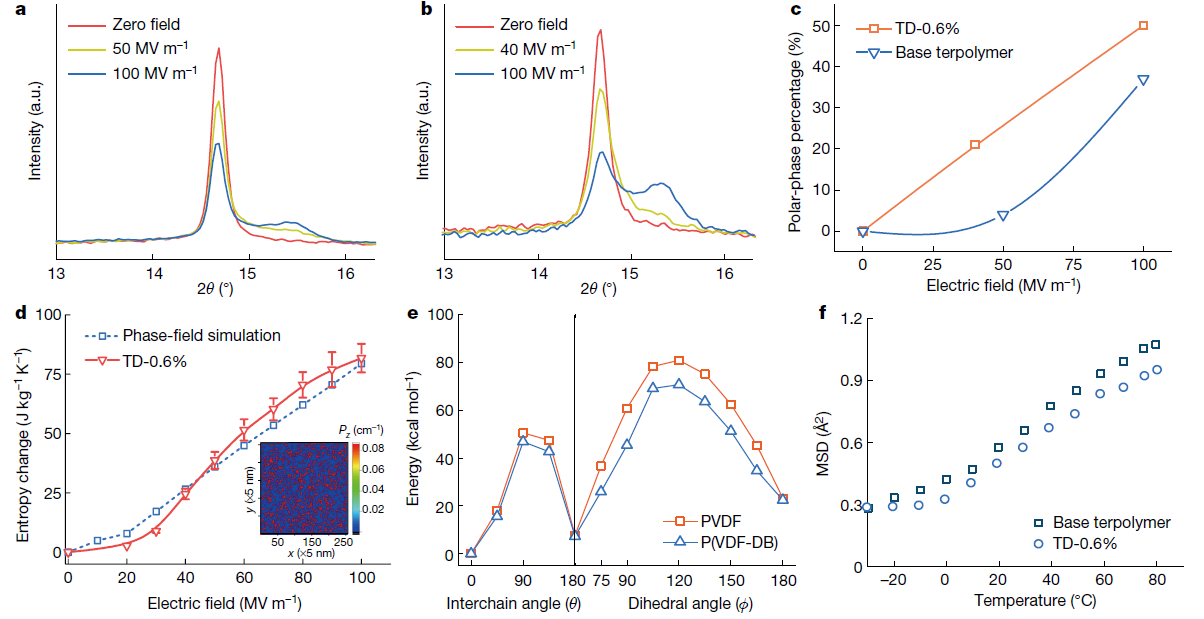 除了提高零场偶极自由度,该高熵高分子在低电场下更容易发生相变。上海光源同步辐射19U,16B线站原位电场下的X射线衍射结果表明,极化高熵材料的相变能垒更低,外加电场后极化晶区的比例更高,在低电场驱动下相变能力提高5倍。同时,准弹性中子散射实验表明,高熵高分子高频震动受限(1ns),因而该高熵高分子能够在实现低场高电卡效应的同时表现出较高的机械强度,有利于探索该型材料后续产业化工艺。