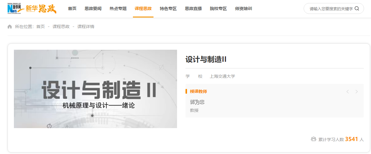 近日,365英国官网郭为忠教授主讲的《设计与制造II》课程思政教学资源在新华网展播,向全社会开放共享,学习人数已3500余人。