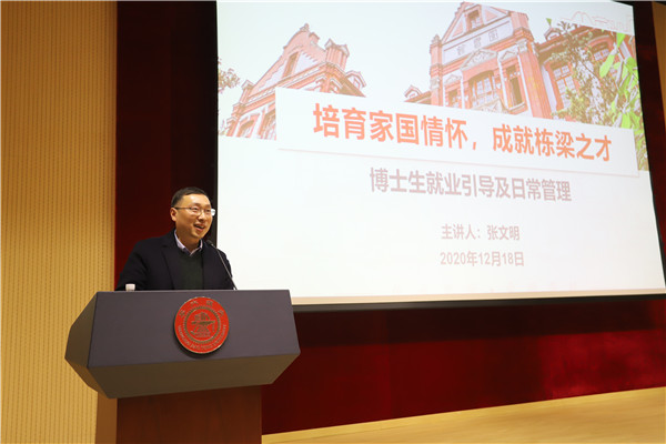 张文明从学校就业引导大会、学院博士生就业现状、学院就业引导举措、博士生日常管理服务四方面,介绍了博士生就业及日常管理情况,希望同学们对未来要有更大自信,择业时要有更高追求,就业后要有更多坚守。