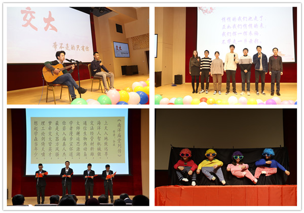 晚会内容结合当下流行元素,涵盖舞蹈、歌曲、配音、古琴等多种形式。师生们演唱了《成都》、《梨花又开放》、《让》、《稻香+大碗宽面》、《野狼disco》,诗歌朗诵了《南洋庙堂列传》、《临江仙·交大岁月》,古琴弹奏了《良宵引》,并带来方言版的配音秀、魔术《纸牌游戏》以及创意节目《小人舞》。节目中间穿插了趣味游戏,引来欢声笑语。
