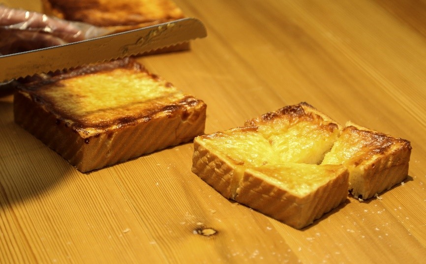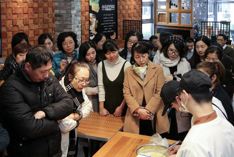 烘焙师现场“示范教学”,详细讲解了甜点制作和烘焙技巧,在烘焙师的指导下,大家有模有样地动手实践,称重、涂抹,将一片普通的面包打造成“热卖单品”。“黄金乳酪”面包从烤箱中取出后,香气四溢,大家满是幸福地分享美味,现场其乐融融。