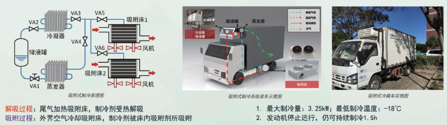 现有的机械制冷是依靠发动机驱动压缩机,有增加油耗、污染环境的缺点。发动机30%-40%燃烧热能随尾气排放,这些热能足以实现冷藏车吸附制冷。如何利用发动机尾气余热实现制冷?这面临很大的技术挑战:尾气温度波动大,夏季工况极端难以实现冷冻;车上空间有限,气体换热系数小,难以实现紧凑化系统高校换热。
