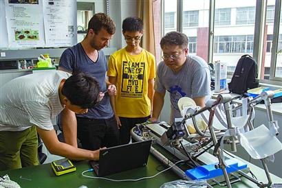 闫维新(右一)正和研究生一起在实验室调试外骨骼机器人。