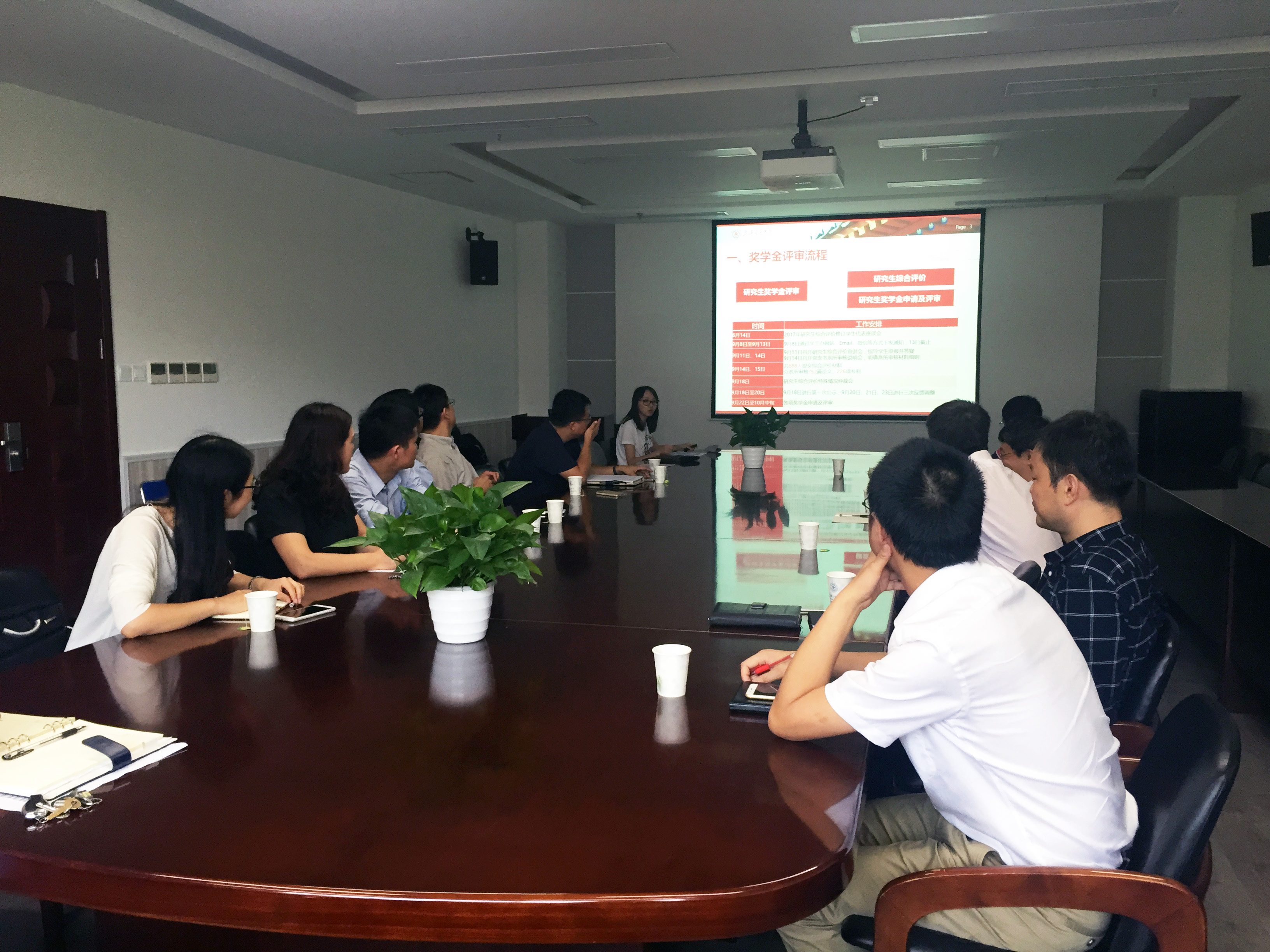 学工办思政教师张碧菱介绍了学院2016-2017年度研究生综合评价及国家奖学金前期材料评审工作,目前学院已顺利完成前期筹备工作并将进入候选人公开答辩环节。